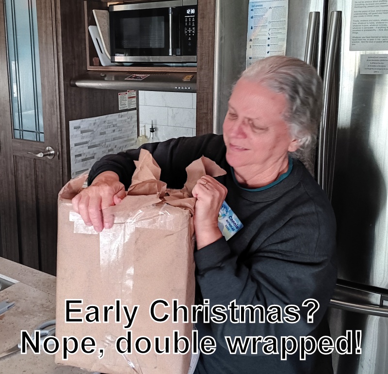 Our weather wasn’t very pleasant this month. Around Christmas we had 4 days in the low 70’s and there were 3 days in the 60’s. We turned off our water 4 nights where it was in the 20’s or below freezing for the whole night. We have to use our propane furnace when it is below 45, which was many nights. We woke on the 20th to a heavy frost and stayed in until it melted off (we don’t have ice scrapers any more). Lots of drizzly days and some foggy mornings. Connie started crocheting some slipper socks (her ankles were getting cold) on the 1st and had them finished the next day, nice and toasty tootsies now. Only one stormy night, the 29th, with cold temperatures, 40+ mph wind gusts starting around 11 pm, and Connie eventually slept backwards to help some with the sound of the slide awnings flapping around. Even though we have cause to complain and do so at times, we cannot begin to count all the ways God provides and cares for us!