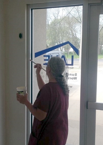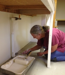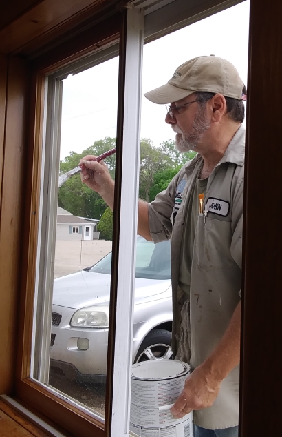 We were also asked to help with some interior repainting of our home church (Lane Christian) in a small town about 15 minutes from our camp. We spent a few days there trimming, John on a ladder doing the ceiling and doors (sometimes with a little artist’s brush) while Connie crawled around the baseboard trim. (Another church member did all the roller work.) We were able to get the long education hallway and some of the entry walls painted with two coats.