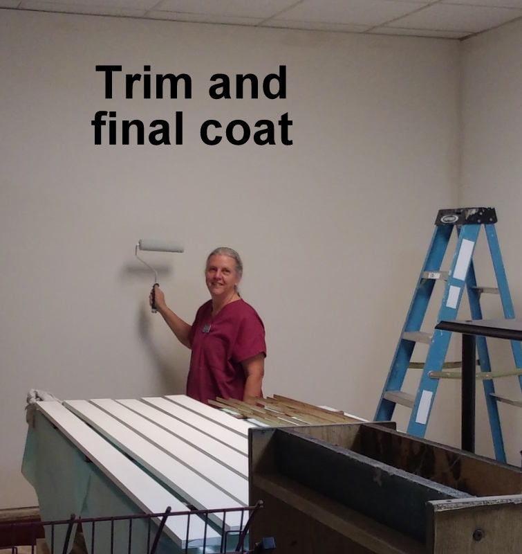The ladies worked at the “Country Store” a thrift store located in an old church building that had several attachments. The roof here was damaged as well and we were allowed to finish up the “holiday room” which needed the new drywall primed and painted. We ladies came up with the trim solution (there was an uneven gap between the drywall and floor trim of 3-4 inches) and talked the guys into spending an afternoon installing the stained quarter round and trim. The woodwork was wiped off as well. Plastic had been put in to help with the leaks leaving quite a bit of dirt/black mold on the beautiful old wood. Along with this we also dusted, vacuumed the carpeted floor wall-to-wall, tried to arrange the book shelves, straightened the linen area, and did some creative marketing with glassware, shoes, and jewelry. This store is an emotional support ministry as well. Everyone gets lots of “sweeties, babes, and honey” as they shop and check out, and this serves as a meeting place for locals to check up on each other and share stories about their time as kids at the church.