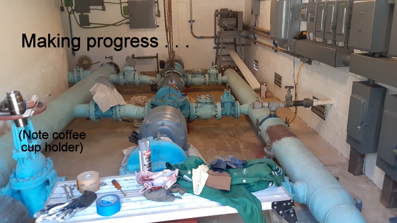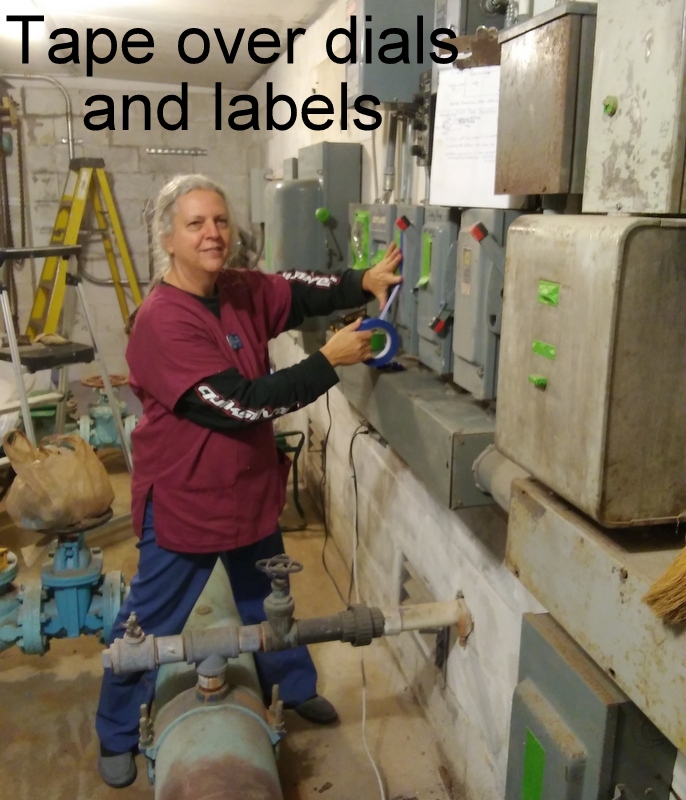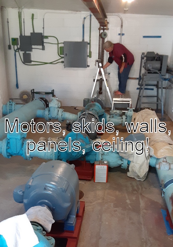 John started with trying to power wash the outside of the building with no success due to mechanical problems. This led to repairing a rotten section of board in the back before turning our time to the inside. Almost three weeks of chipping, scraping, grinding, caulk, cement/grout repair, removing rust with a power chisel and grinders with wire wheels, taping off labels and gages, and finally wiping pipes with lacquer thinner in preparation for painting. There were several nights we both used the massage chair insert to get relaxed and help the stiffness! We worked in lots of dust, dirt, and fumes (with interesting results).