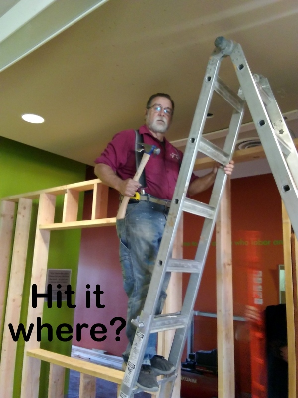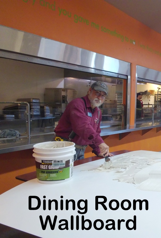 This month the guys and gals have been working separately. John spent the first weeks in the dining room tearing out baseboard, putting up washable wall board with top trim, caulking and sealing all the edges and seams, and keeping the coffee area functioning. It was a big job complicated by all the ministry that happens in this room throughout the day – work a few hours, wait until after lunch, work a few hours, wait until after the bread run, etc. The last week was spent building a new dividing wall complete with some solid glass windows to separate the men and women intake areas. This included framing, putting up drywall, and securing the window frames along with gaining several splinters and ouches.