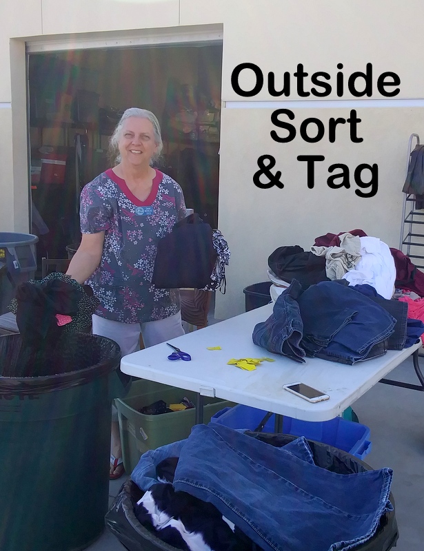 Connie volunteered mostly in the “staging” area for the thrift store that is operated off-site. This included the second round of sorting clothing donations, tagging, and hanging on racks to be taken to the store. It was impressive to see what a few people can do with trucks full of donations – everything was sorted for the “store” or “re-donate” or trash. Only the best of the clothing was kept for their store (new with tags or like-new). Other sellable clothing was re-donated to other area thrift stores (approximate ratio of 1 keep, 5 re-donate, and 8 trash). It really makes us think about what we have donated in the past! There were a few days when it was too cold or windy to sort clothes outside that she was in the kitchen seeing how all the donated food was used – shredding cheese blocks for pasta, making grilled meat/cheese sandwiches, traying sausage links or patties, etc. There was one morning spent helping 10 or more other ladies make peanut butter and jelly sandwiches, cut in half and individually bagged. The goal was 6,000 half-sandwiches to be handed out at the “Tour de Palm Springs” annual cycling event.