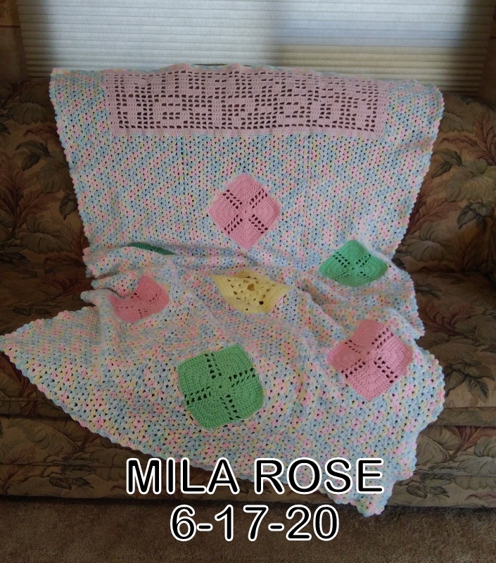 Almost every day we were walking or biking. There is a creek that runs behind the high school property where deer hang out and it is not unusual to see them in the ball field dugouts in the evening. One walk we came upon a racoon coming down the electric pole and onto the fence top to join his friend, less than 8 feet away. Other than going for groceries there were a few trips by bicycle to the post office, great at the start but some fairly steep hills coming home! Connie finished the baby blanket for Mila which incorporated crocheting from 3 generations. The yellow diamond from Mila’s great-great Grandma, the pink and green from great-Grandma, and the remainder from her Grandma. It was fun and very enjoyable, so Connie is researching some knitting projects to use up the many odd pieces of yarn she has. We have also had some conversations on future travels and respite, and are hoping to find an RV park for some winter months to just relax.