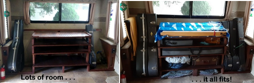 We redesigned our music storage shelving, reducing the depth by 9” to save some weight at the back of the trailer for traveling. That was an interesting weekend project remembering how to get it apart and back together again in a revised configuration. We have also made the time to go through our multiple folders of music. They will be cataloged (lots more typing) so we should only need one copy, and have eliminated about 2 reams of paper, 500 plastic sheet protectors, and a couple of binders – again reducing weight and storage space.