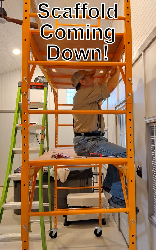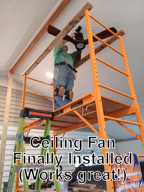 Connie continued to glue up ceiling squares for the multi-purpose room ceiling, completing all 48 on the 10th. Two sides are ‘square’ with the remaining sides needing trimming as we put them up in the spring. John continued making, painting, and putting up trim boards in the addition, installed the ceiling fan, then started cleaning and painting the remaining walls. November 19th we were done with the scaffold, dismantled it for storing, and had the spacious room we planned. Remaining days were spent cleaning up, vacuuming, and arranging now that stacks of wood are gone.