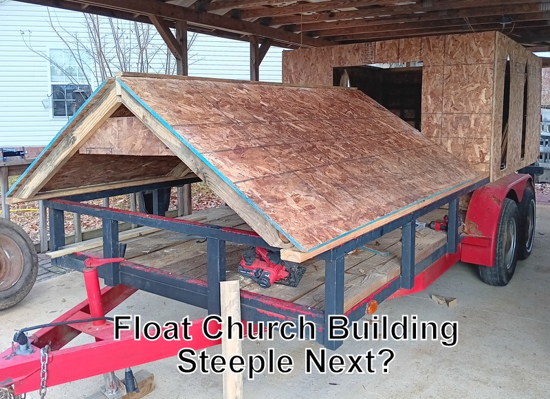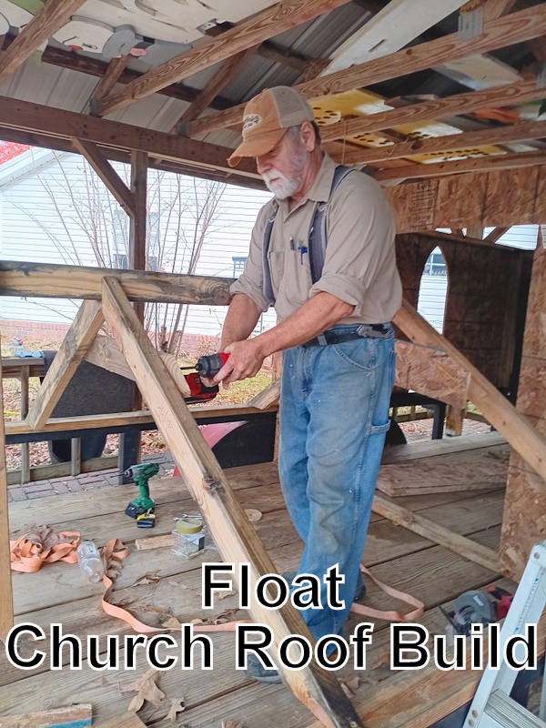 John and two others started on the Journey Church float a bit earlier this year. There were three ‘work days’ (two of which started with breakfast out, they “had” to get materials). This year’s theme is ‘gingerbread house’ so they designed a gingerbread church, roof, steeple, and picket fence all decorated with various candies and lollipops. The basics were done when we left with several coats of paint and final decorations needed. We’ll add a photo next month of the completed project. John also helped change out the US and church flags that line the church driveway.