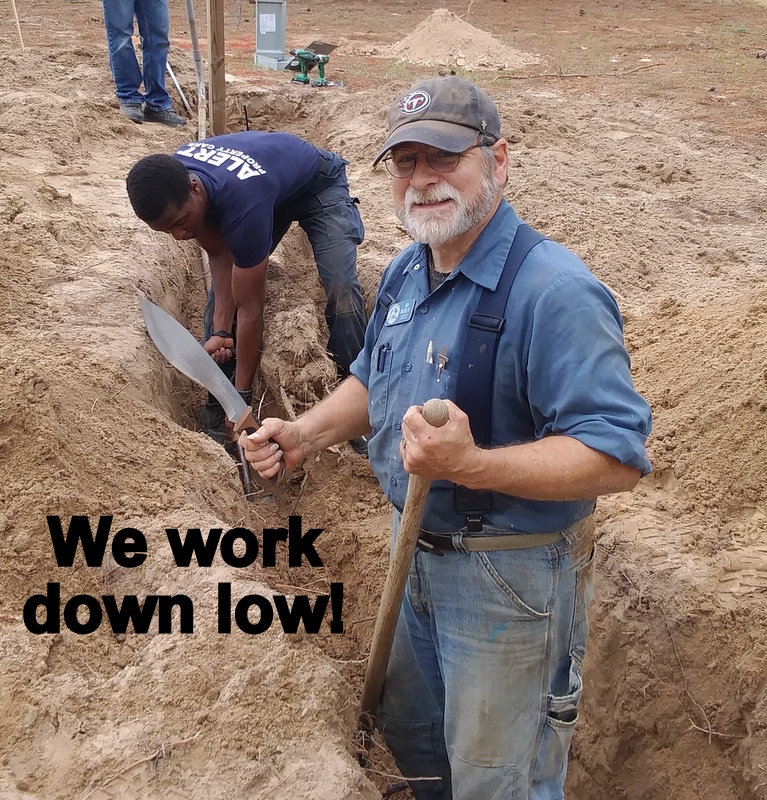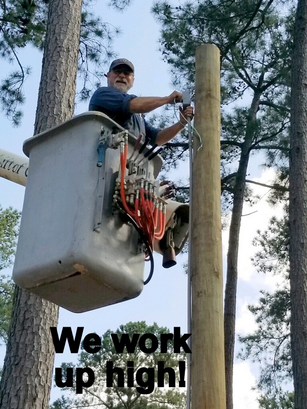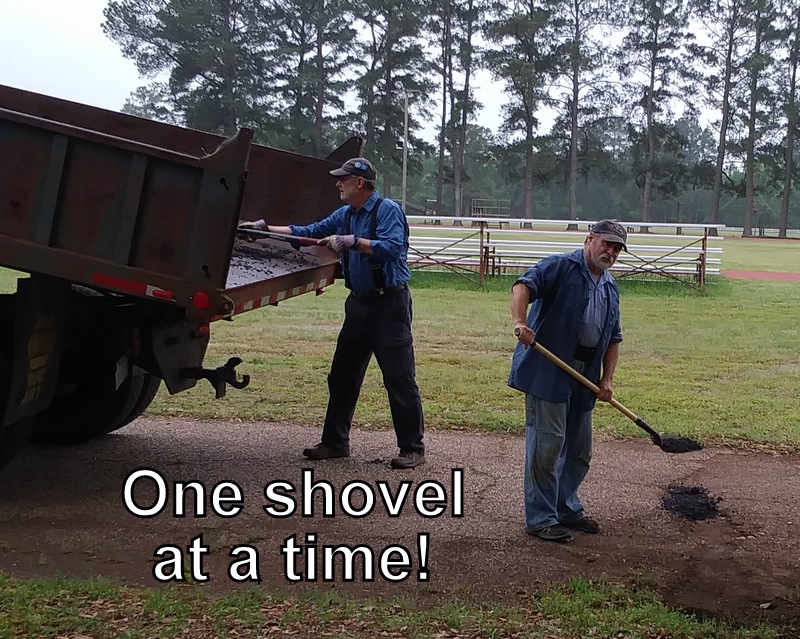 John and the guys spent most of their time upgrading 8 camp sites for big rigs. Lots of digging of trenches for water, sewer, and electric (lots of sand in the wash machine too!); putting in posts for electric boxes and a high post to mount the wifi repeater with a boom bucket; laying underlayment, and shoveling asphalt to park on. The last few days they were patching holes in the roads and moving bleachers and chairs to prepare for a large group coming in.