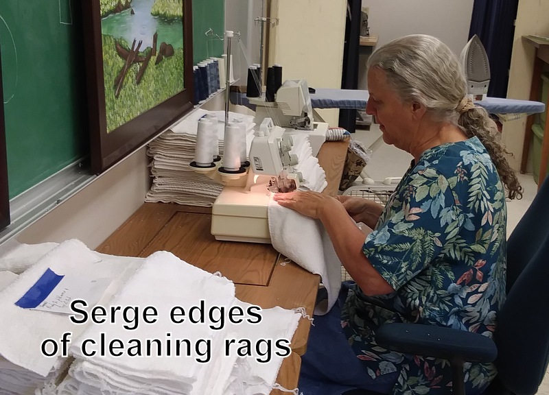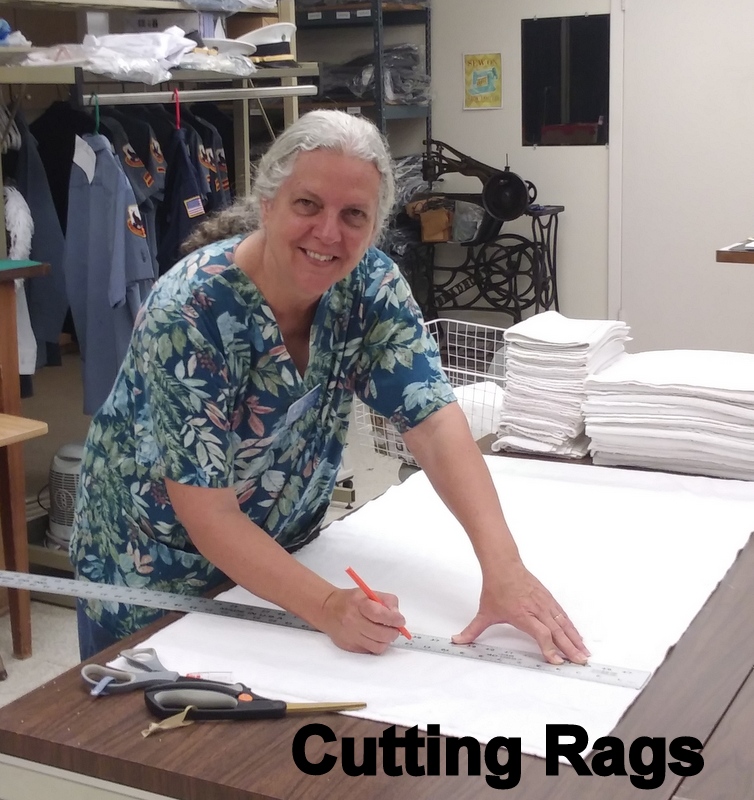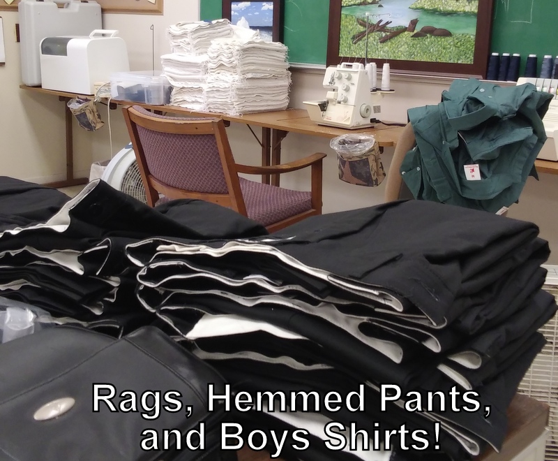 Connie graduated to a “sewing SOWER” this month! She spent her time in the sewing room starting with ripping seams for the new recruit shirt alterations and cutting out the body of an eagle for a banner. Into week 2 she did a lot of ironing – shirt sleeves for patch locations and dress pants for hemming, and cutting old towels into appropriate rag sizes. Finally, instructions on use of the serge sewing machine and getting to sew! The final days were ironing, cutting, and hemming the sleeves on boys’ shirts for Father Son camp. It was a lot of fun.